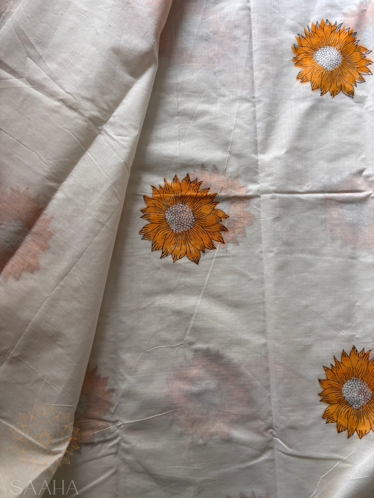 Sooryakanti_Handwoven Cotton Kerala Saree with handblock printed sunflowers